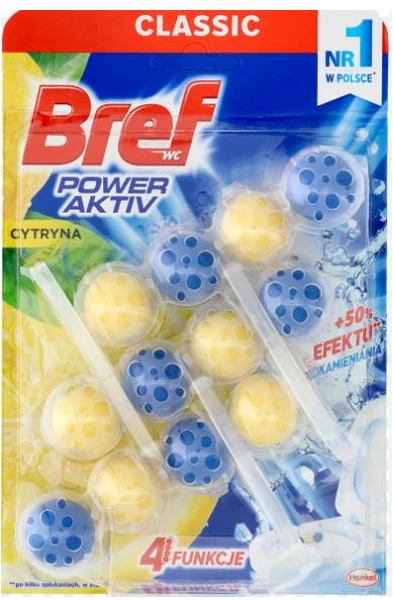 BREF POWER AKTIV. Zawieszka myjąco-zapachowa do muszli WC. Uwaga. Działa drażniąco na skórę. Działa drażniąco na oczy. Działa szkodliwie na organizmy wodne, powodując długotrwałe skutki. W razie konieczności zasięgnięcia porady lekarza należy pokazać pojemnik lub etykietę. Chronić przed dziećmi. Stosować rękawice ochronne/ ochronę oczu. W przypadku kontaktu ze skórą: Umyć dużą ilością wody. W przypadku dostania się do oczu: Ostrożnie płukać wodą przez kilka minut. Wyjąć soczewki kontaktowe, jeżeli są i można je łatwo usunąć. Nadal płukać. W przypadku utrzymywania się działania drażniącego na oczy: Zasięgnąć porady lekarza. Całkowicie opróżnione opakowanie usuwać do odpadów komunalnych wg lokalnych zasad.