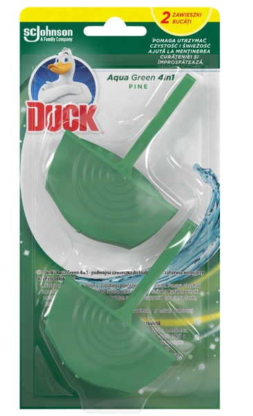 - Duck Aqua Green 4 w 1 podwójna zawieszka do toalet, która zabarwia wodę przy każdym spłukaniu.