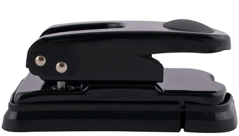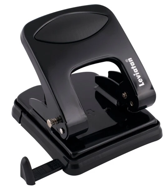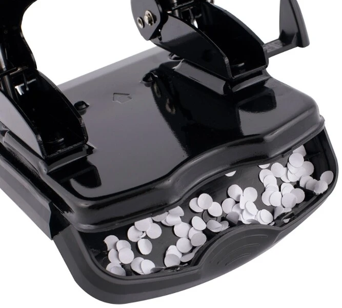Dzięki blokadzie położenia dźwigni z zabezpieczeniem, ten poręczny dziurkacz z pewnością zmieści się w biurowej szufladzie.
