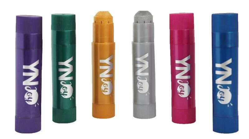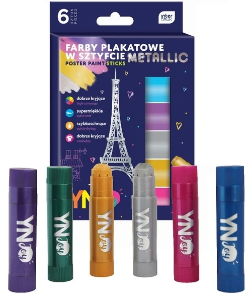 Farby plakatowe w sztyfcie w 6 metalicznych kolorach.