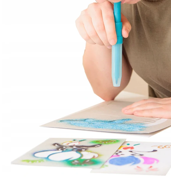 Specjalny tusz w nich zawarty, po dmuchnięciu w marker, pozostawia kolorową mgiełkę na papierze.