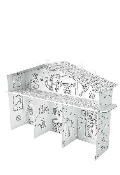 Przestrzenny, wielopiętrowy domek-kolorowanka wykonany z wytrzymałej tektury oklejanej białym kartonem.