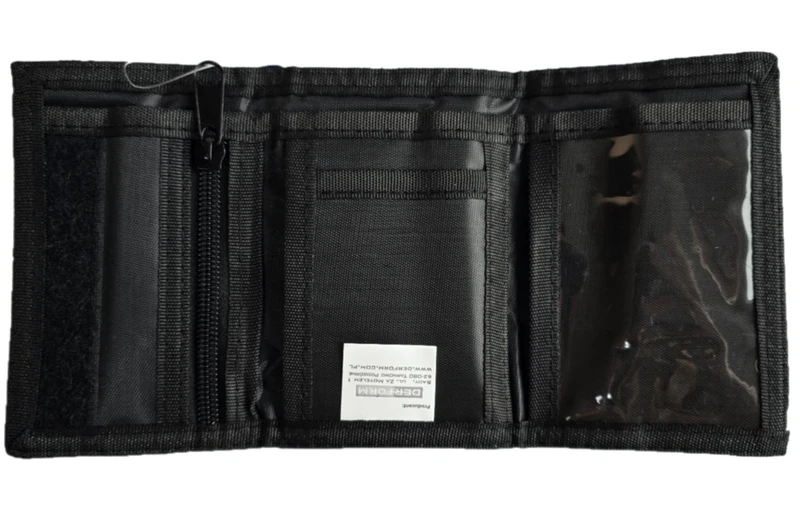 Portfel wyposażony jest w zapięcie na rzep, co zapewnia wygodne zamykanie. W środku znajduje się przegroda na banknoty, miejsce na karty oraz osobna kieszonka na drobne, zamykana na zamek. Dodatkowo, znajdziesz również kieszonkę z okienkiem na zdjęcie.