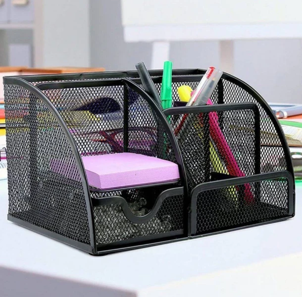 Przybornik na biurko organizer siatka 6 komór+ szufladka czarny