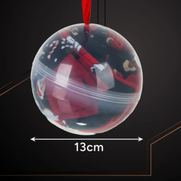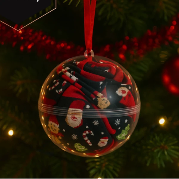 Prezent gotowy do wręczenia bez pakowania. Skarpety zapakowane są w elegancką bombkę z zawieszką, dzięki czemu tworzą idealny, gotowy upominek na Święta lub Mikołajki. Nie potrzebujesz papieru ani torebki prezentowej - wystarczy położyć pod choinką.