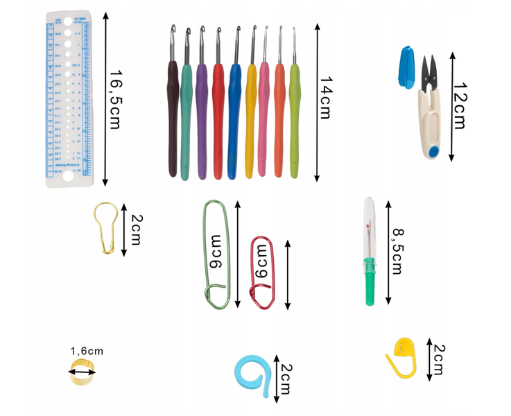 - zawiera wszystko, co potrzebne - oprócz szydełek w różnych rozmiarach znajdziesz także 40 motków włóczki, taśmę, obcinaczki i inne akcesoria – aż 113 elementów!