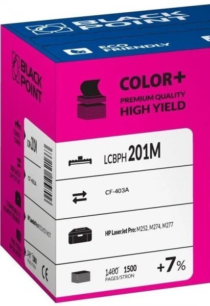 Toner laserowy Black Point LCBPH201M do drukarek laserowych HP. Zastępuje HP CF403A. Kolor: magenta. Wydajność: 1500 str. (więcej o 100 stron - ISO 19798). Kompatybilny z HP LaserJet Pro: M252, M274, M277.