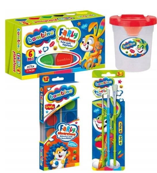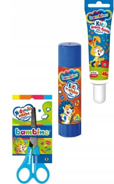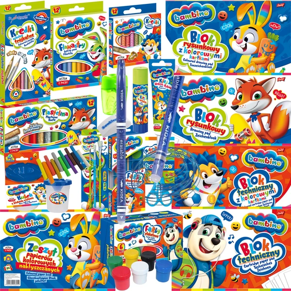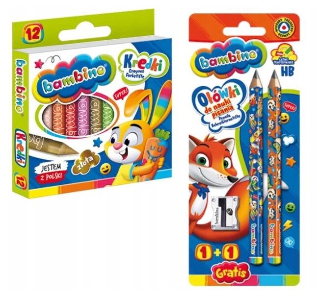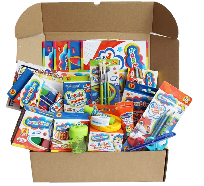 Wyprawka Bambino stworzona specjalnie dla dzieci uczęszczających do 1-3 klasy szkoły podstawowej lub wyżej. Zawartość dobrana, tak aby jak najbardziej odpowiadała potrzebom dzieci oraz wymaganiom większości szkół.