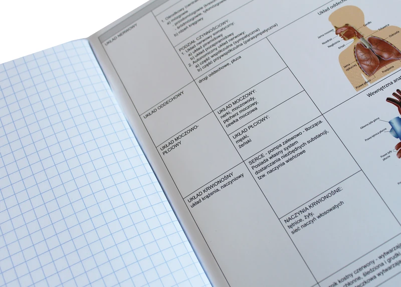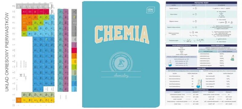 Wysokiej jakości uszlachetniona okładka. W hybrydowych zeszytach tematycznych znajdziesz "pigułkę wiedzy", na przykład w zeszycie do chemii, układ okresowy pierwiastków.